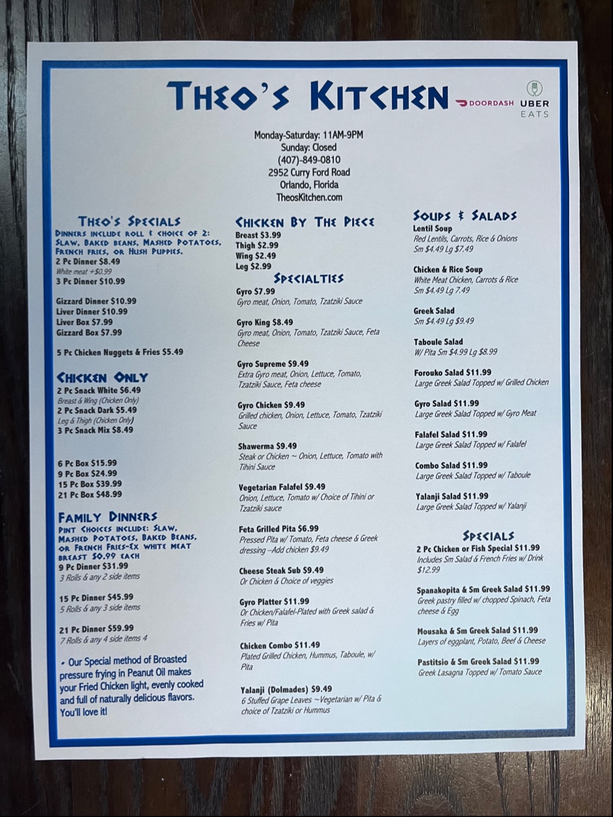 Welcome to Theo's Kitchen, a culinary gem nestled at 2952 Curry Ford Rd, Orlando, FL. This charming eatery offers a delectable fusion of Greek delights and American favorites, promising an unforgettable dining experience.